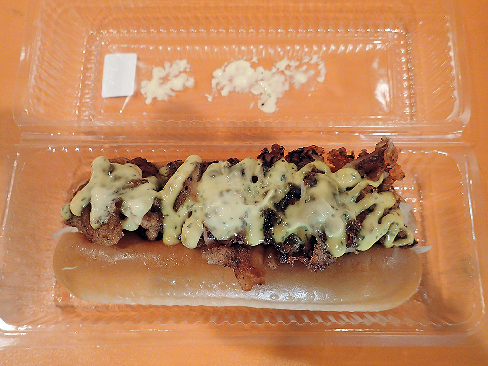 すぐ目に付いたのが「海峡ドッグ」の看板。「店員さんによる手作りなので個数限定」というのも、より「ご当地レベル」を上げてくれています♪ 写真はワタシが購入した「最後のひとつ」! 海峡ドッグはヤリイカの唐揚げと、キャベツと玉ねぎのマリネを詰め込み、マスタードソースをかけたもので、ボリュームもあるし、味付けもかなり上級なんですよ!