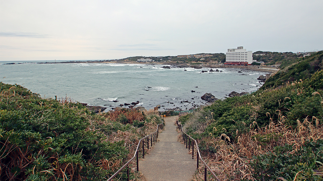 海岸近くまで降りる階段から眺めた図。奥にはボクには無縁の高級ホテル「銚子グランドホテル」があります♪