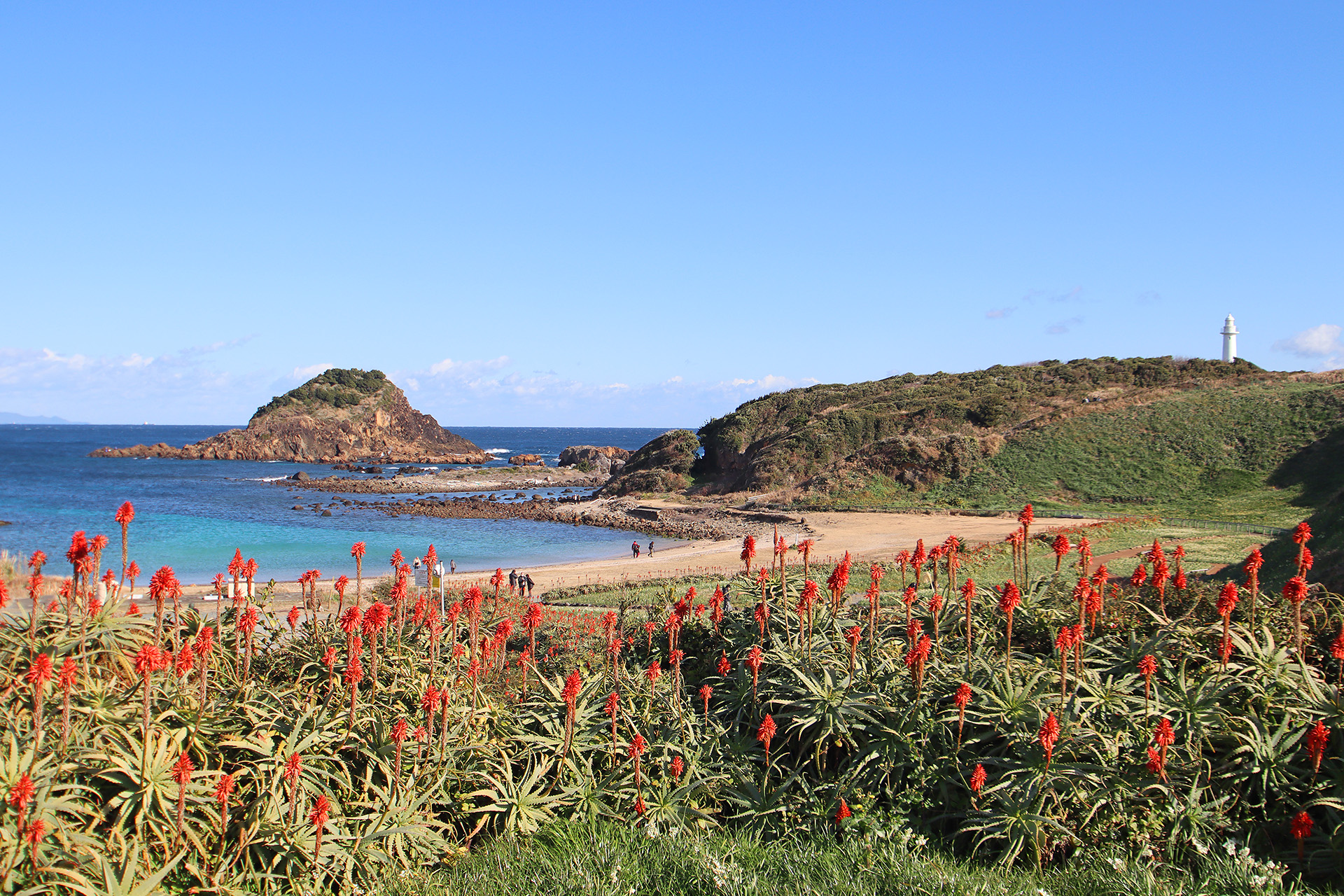「爪木崎」には水仙の群生地があり、ピーク時には300万本もの水仙が咲き乱れるらしいです。今回(2月中旬)訪ねた時は水仙はほぼ見られなかったですが、写真のようなアロエの赤い花がまだ残っていましたよ。