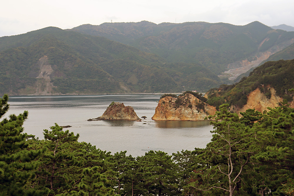 この輝きは「昭和63年に静岡県の天然記念物に指定された自然現象」で、風化した安山岩が付近から湧き出る「温泉水」によって変質した「プロピライト」という鉱物が、「日本一の西伊豆の夕日」によって輝くという仕組みのようです。