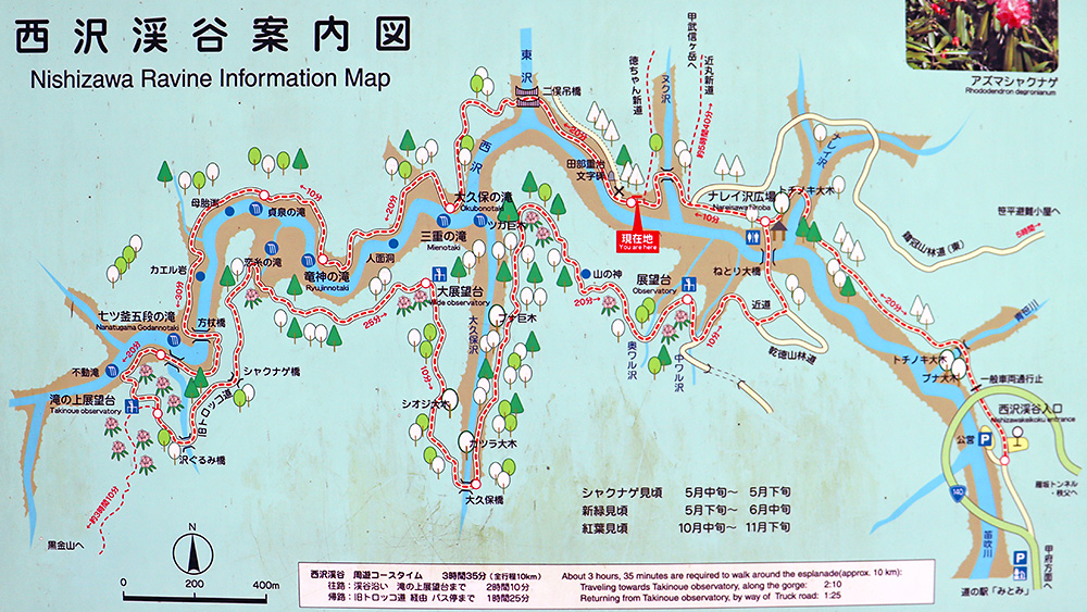 少し先の「道の駅みとみ」の無料駐車場に駐車するのが一般的みたいですが、今回ボクは左の写真の「西沢山荘」の駐車場(500円)を使わせてもらいました。こっちの方が歩く距離が少ないので♪