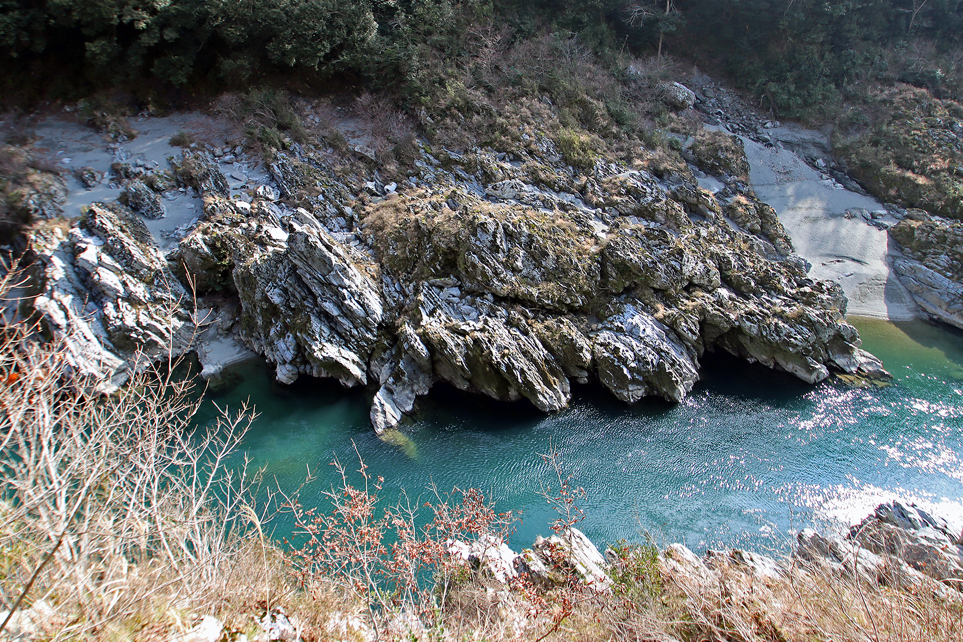 大歩危は吉野川の中流にある岩石地帯です。このゴツゴツとした岩場は、中生代ジュラ紀から白亜紀にかけての海洋プレートの沈み込みにより大陸側に付加された後に地下深くに押し込まれ、高い圧力のもとで再結晶した「結晶片岩」です。
