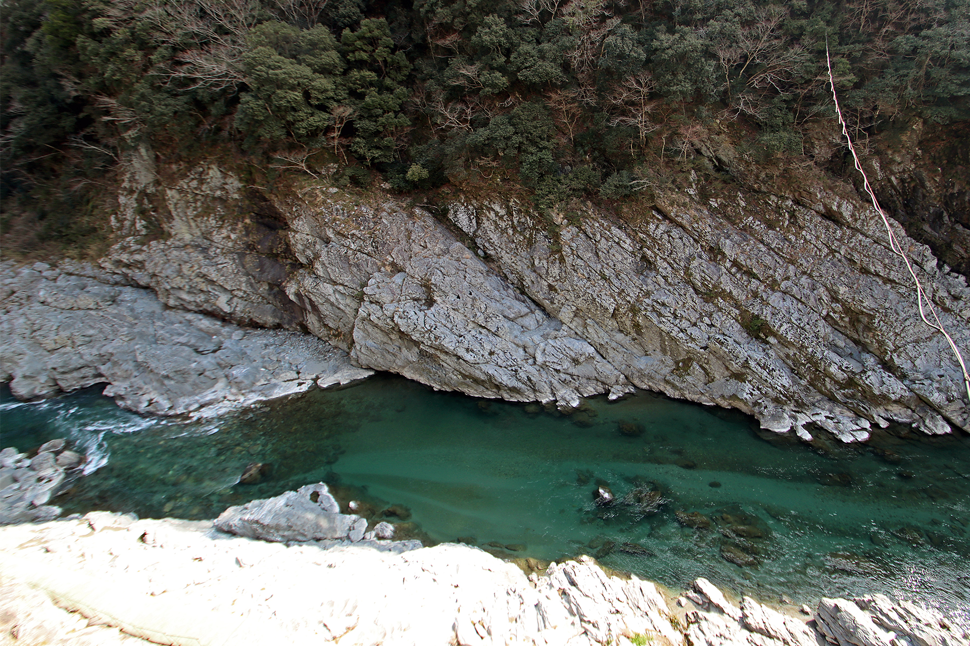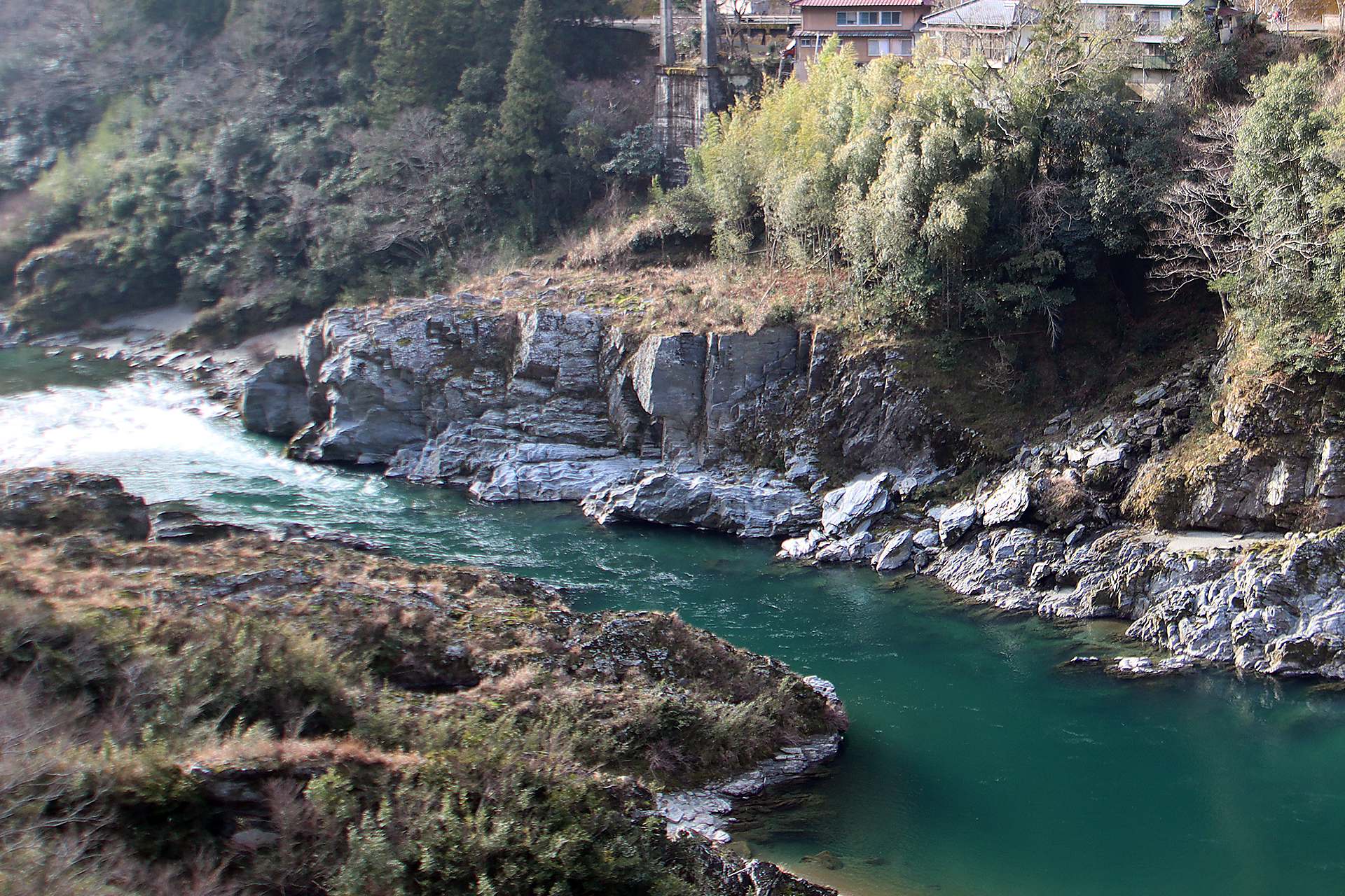 河床と河岸には「三波川変成岩(さんばがわへんせいがん)」と呼ばれる結晶片岩がよく見られます。