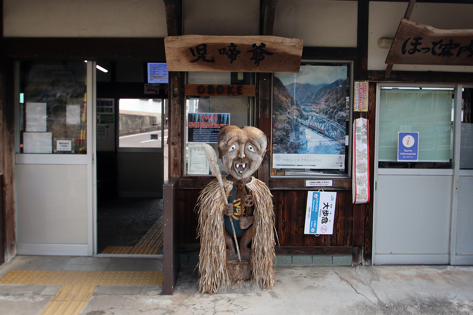 JR「岡山駅」から「特急 南風」で約1時間30分ぐらいで「大歩危駅」につきます。そこから徒歩15分ぐらいで「妖怪屋敷」のある道の駅につけますよ。