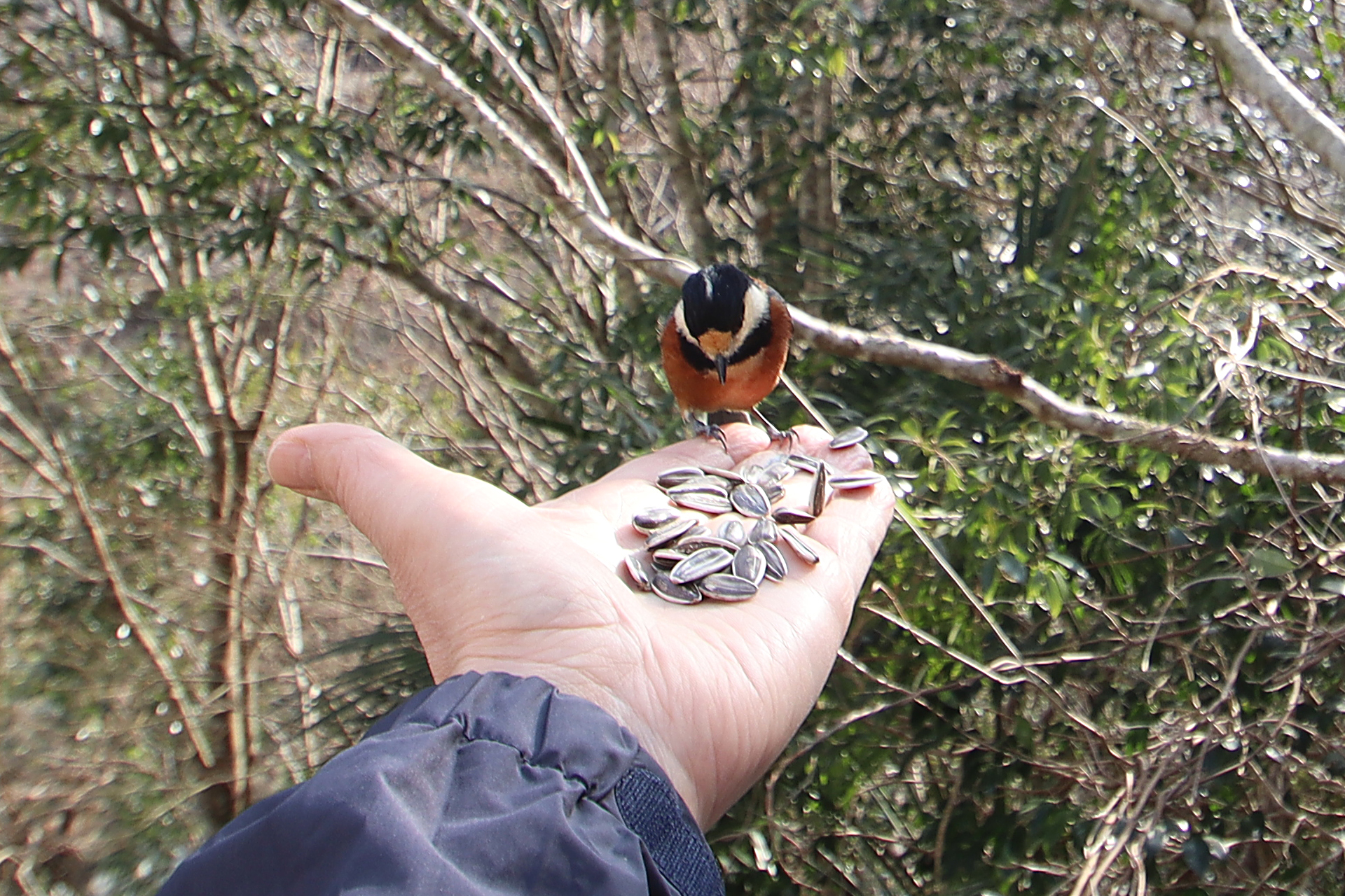 この辺りの小鳥は凄く人に慣れていて、下の写真みたいに自分の掌の上で餌付けすることもできるんですよ! なんか自分が仙人にでもなった気分でしたwww