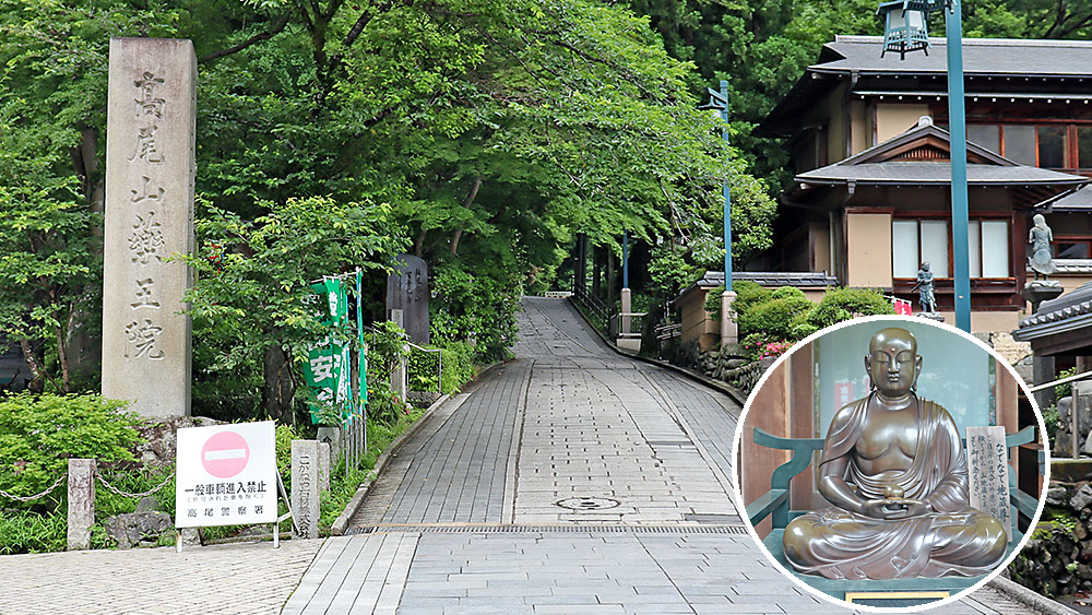 高尾山一号路入り口:「高尾山口駅」を出たのが7時5分ごろ、約10分後に東海自然歩道の入り口に到着しました。入り口わきの不動院にて、「なでなで地蔵尊」の膝や足を撫でて「痛風完治祈願」をしてから登りました。(7:13)