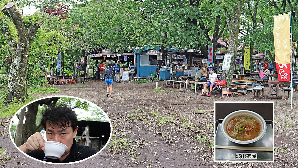 小仏城山山頂:ここでは「なめこ汁」と「デカいかき氷」が有名ですが、ボク的には「もつ煮」の一択です。疲れているせいか不機嫌な顔で食べていますが、実際はとても幸福感に包まれていたのです♪(10:48)