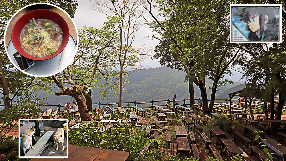 景信山山頂:かなり売店が充実していて、お座敷で「天婦羅をあてにしこたまビールを飲んでいる中高年グループ」がいるぐらい。「猛犬注意」の張り紙の脇に、結構元気のいい犬が(合計3匹だと思う)います。たいして空腹ではなかったけど「きのこラーメン(という名前だったかな?)」を食べたら、量が結構多くて、その後の胃もたれの原因となってしまいました。我ながら情けない・・・。また景信山は「鬼滅の刃」の登場人物と関係があるようですが、あまり詳しくないので・・・。(12:09)