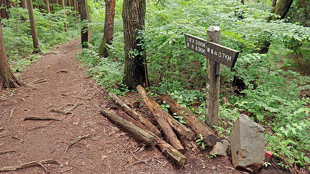 なんとなく山道っぽい:やっぱり土の上の歩くのは楽しいですねぇ。たまに「木の根が密集する場所」があり、痛風で膝の調子が完全でないボクにとっては結構つらかったけど、概ね「足にやさしい道」です。定期的に写真のような標識が出てきて、陣馬山までの距離が表示されているのが嬉しい。「高尾山から景信山」よりも「景信山から陣馬山」までの距離の方が長いのですが、道が良いので意外と楽かも。