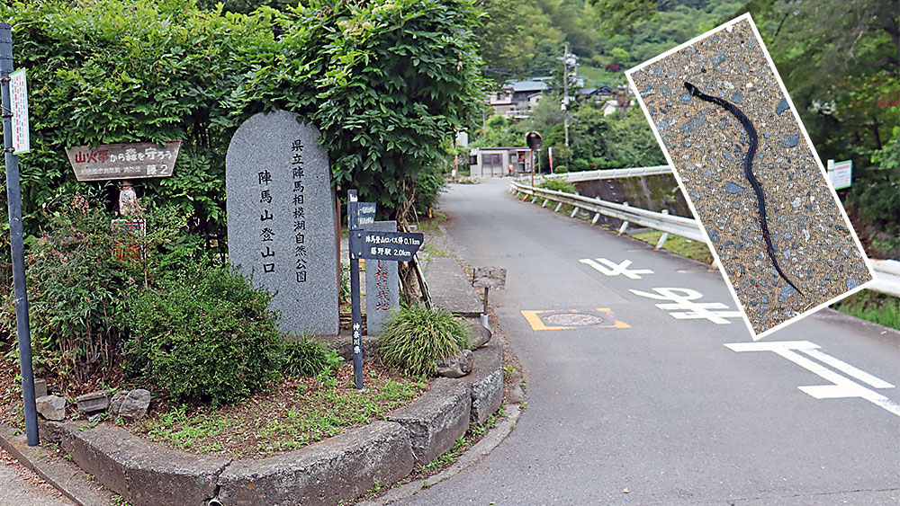 ようやくバス通りについた:さらにここから「藤野駅」まで40分ぐらい歩くことに。膝は結構痛いのですが、歩けないということではない感じ。もう少し慣れは必要だけど、なんとかよくなってきた感じはしますねぇ。道端で見つけた「(たぶん)マムシの赤ちゃん」がかなり不気味。こいつがデカくなれば猛毒を持った恐ろしい存在になることはわかってはいるのですが、都会育ちの軟弱なボクには殺すことができませんでした・・・。(17:37)