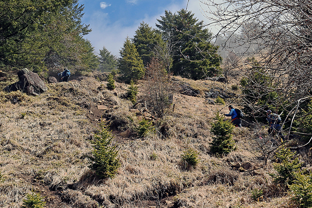 少しずつ急になってきますが、足場はまだまだ柔らかい土です。で、後ろを振り返ると・・・