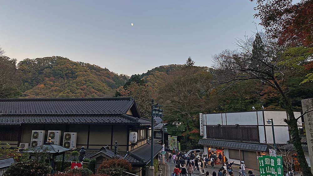 高尾山から下山すると、黄昏てきた空に月が輝いていました。8時間を超えるトレッキングもようやく終わり、ご苦労様でした自分♪