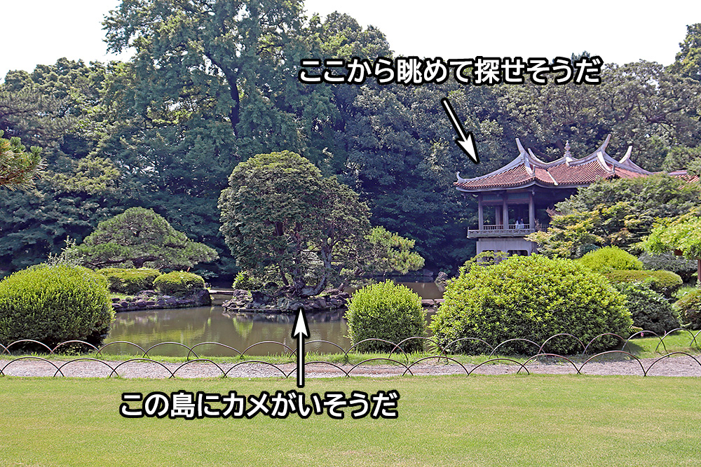 中国っぽい建物の中から島を眺めると、いた、いましたよ、カメが!