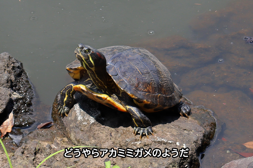 上の二枚の写真のカメ、扁平な甲羅、東部側面の赤い線、頸部の黄色い線がハッキリ判ります。まずアカミミガメで間違いないでしょう。