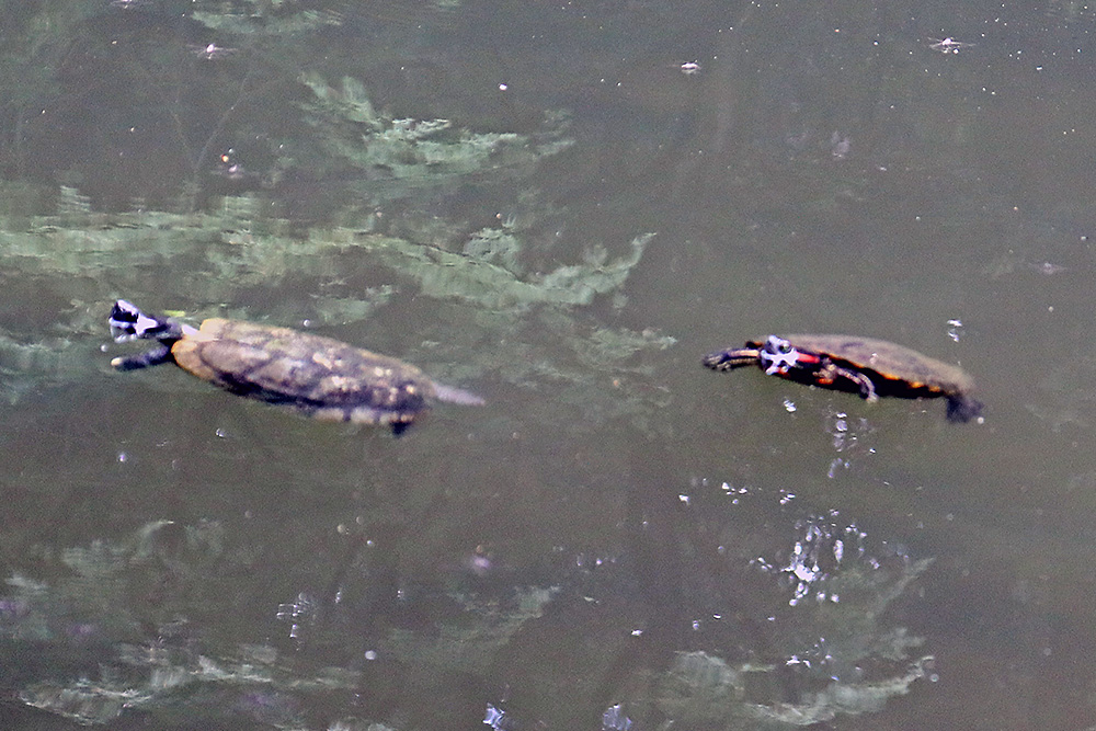 イシガメとアカミミガメとのランデブー風景。別に敵対同士ってわけではなさそうです。
