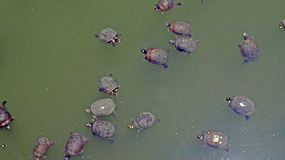これが「亀の池」に作られた「甲羅干しのための斜面」ですが、ここにもウジャウジャと!