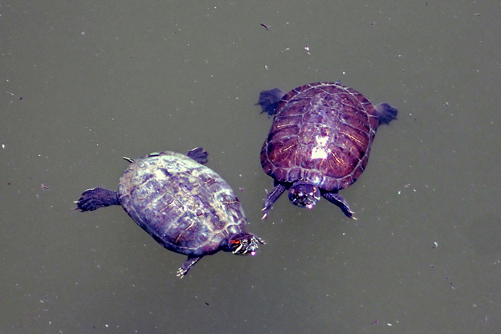 ズームアップして見てみます。どちらも「アカミミガメ」でした。