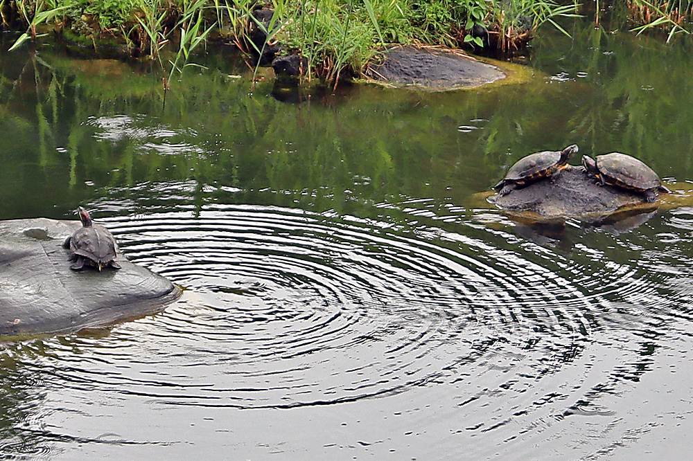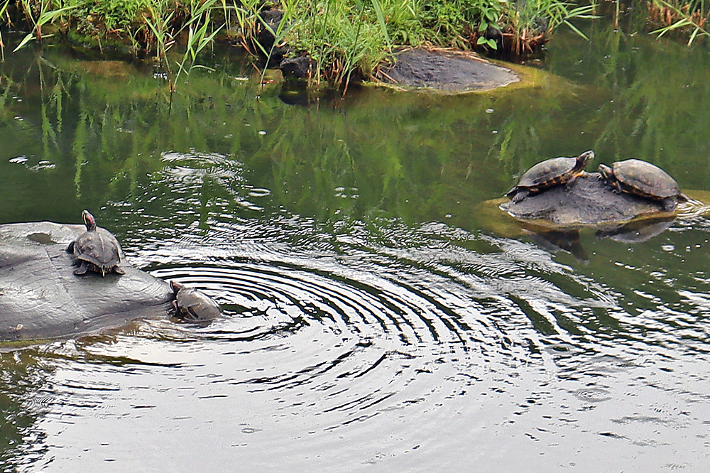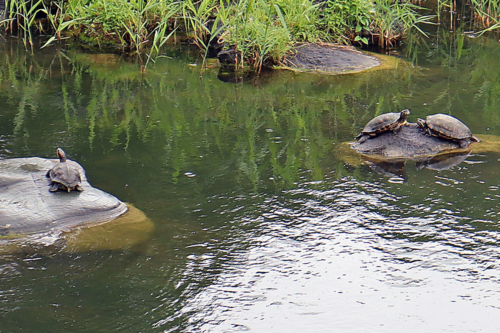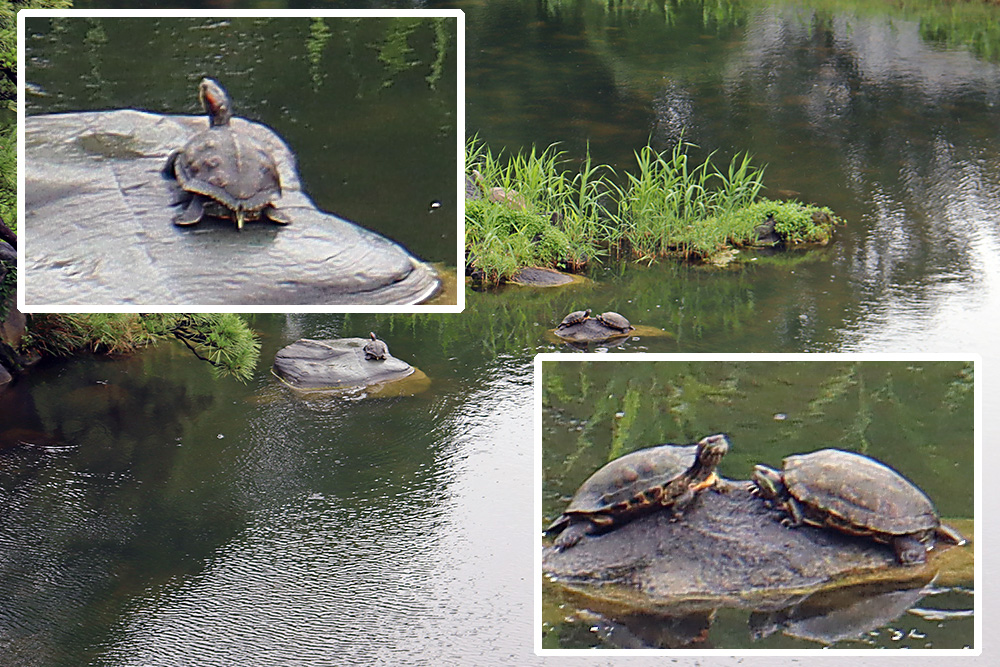 現われた直後の写真を拡大すると、どうやら「ミシシッピアカミミガメ」のようですねぇ。本物と偽物(左上)の区別が難しい。