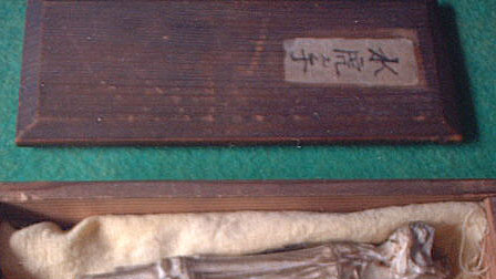 河童の手のミイラ」の近影です。大きさはだいたい「猫の後足」ぐらいのイメージですかね。形状も「猫の後足」のような感じです。ていうか「猫の後足」なんじゃねぇ? とか言っていると後述する「河童大明神様」にどやされてしまいますよ。