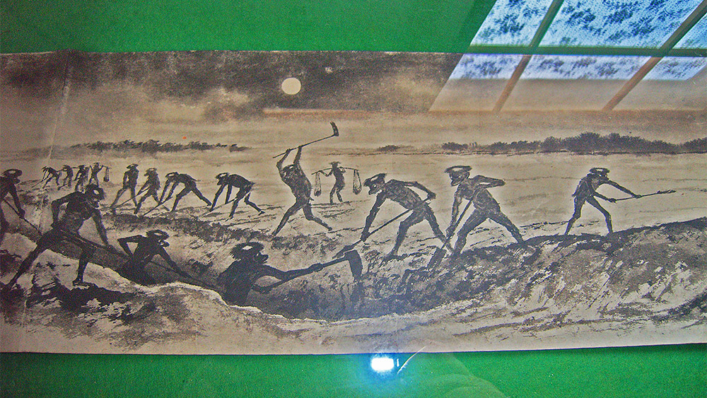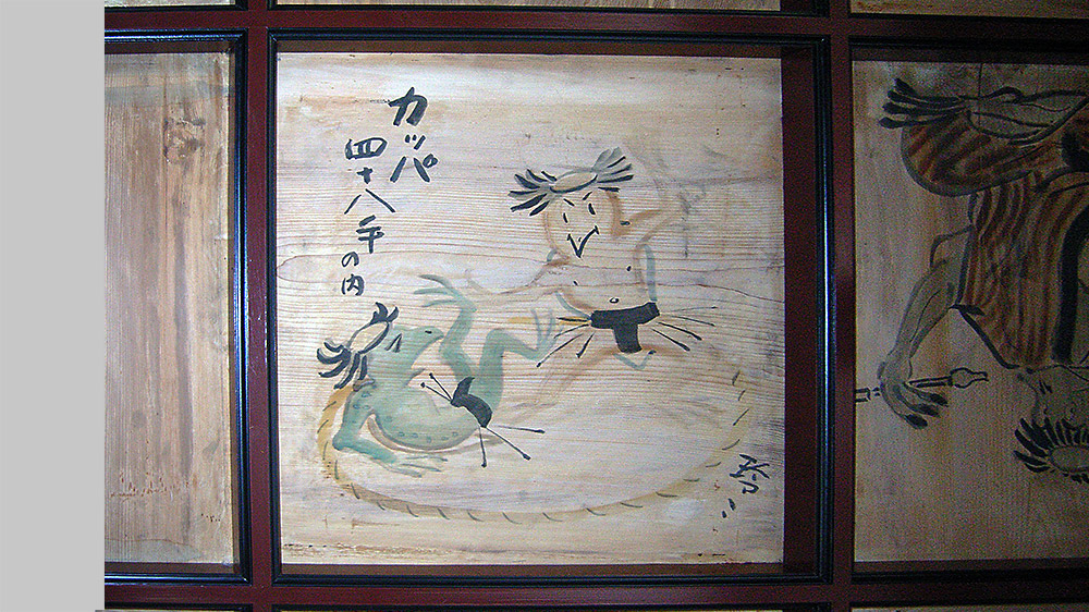 曹源寺「河童堂」に祀られている「喜八さんの治水工事を手伝う河童たちの絵」です。大勢の河童たちがこの土地を改善してくれたのですねぇ。