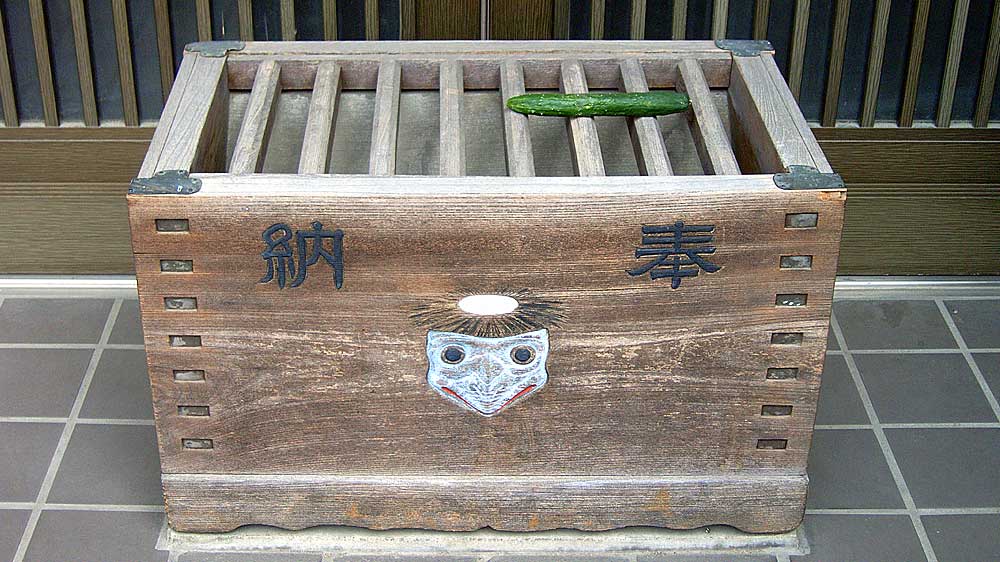 「河童堂」の前にあるお賽銭箱。ちゃんとキュウリがお供えされていた♪