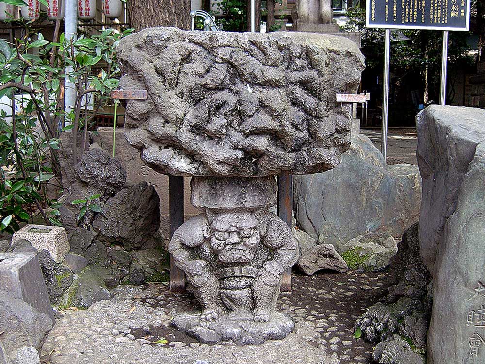 この石像は文政年間《1818〜1829》の作で、案内板によれば 「この水鉢は文政の頃より加賀美某の邸内にあったが、 毎夜井戸で水を浴びるような音がするので、ある夜刀で切りつけた。 その後 家人に病災が頻繁に起こったので、天保四年(1833) 当社に寄進された」とのことですが、真偽のほどはいかに?
