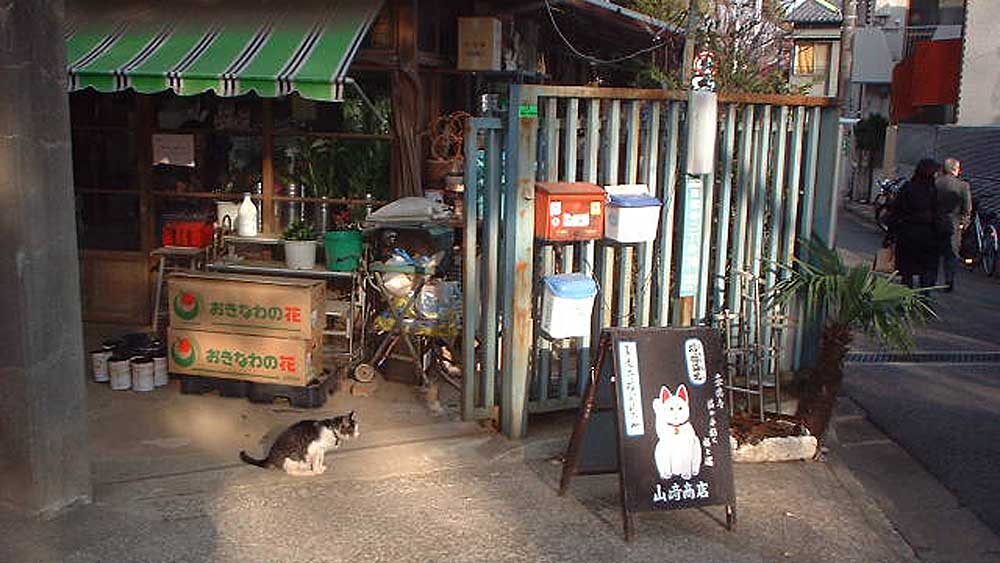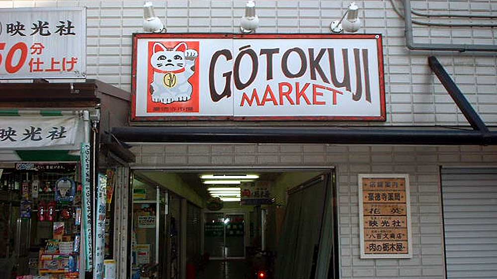 豪徳寺の駅近くで見かけた看板の猫は何故か左利き。「豪徳寺の招き猫は右手を上げている」という基本が徹底されていないのが、逆に今風。