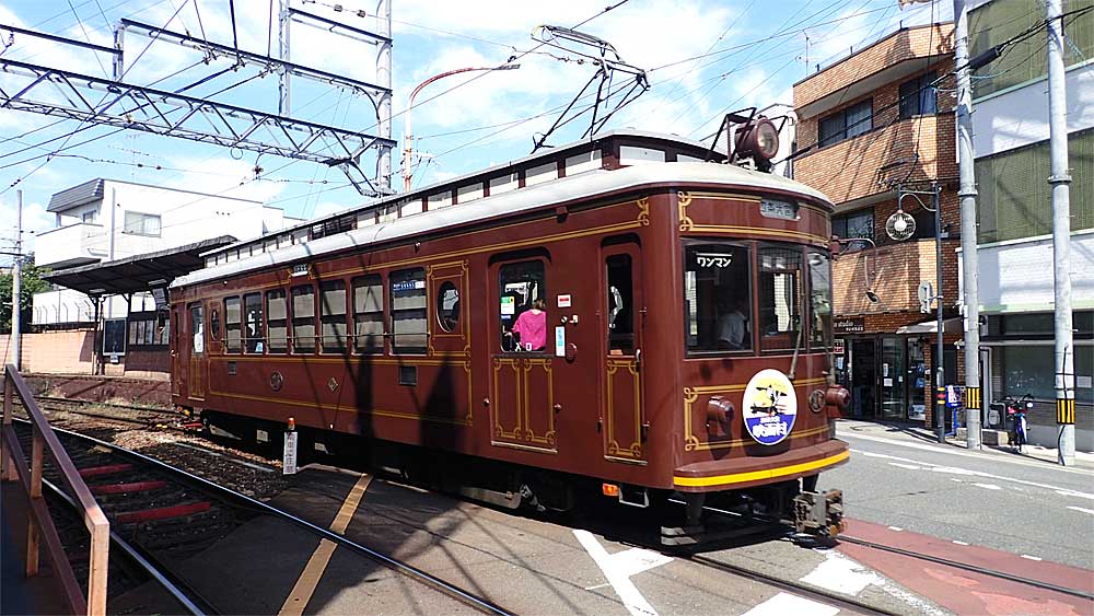 神社の直ぐ近くを走る路面電車『嵐電』。京都の街並に合う実に良い色しています。