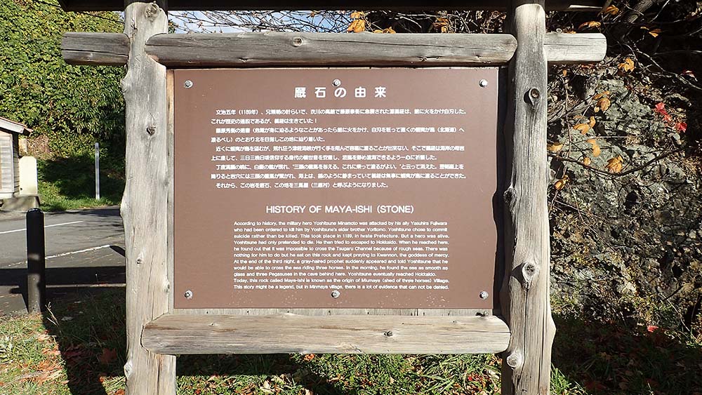 ■ それ以来この奇岩は「厩石(まやいし)」、この地は「三馬屋(みうまや)」または「三厩(みんまや)」と呼ばれるようになった。