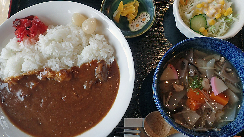 角栄氏も大好きだったという郷土料理「のっぺ汁」とカレーライス。「のっぺ汁」とは「葛でとろみをつけた野菜の煮物」で素朴な味が逆に嬉しかったです。